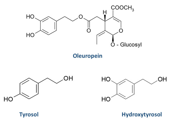 Chemical structures of oleuropein, tyrosol, and hydroxytyrosol.