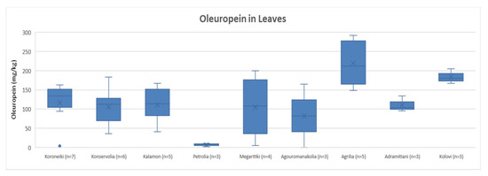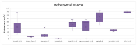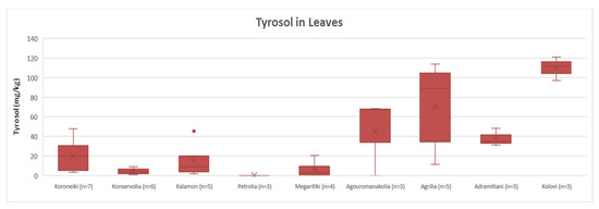 Descriptive statistic (box and whisker plot) and statistical analysis (ANOVA) were performed for the varieties whose number of samples was equal or higher than three (n ≥ 3). For leaves, the varieties Koroneiki, Konservolia, Kalamon, Petrolia, Megaritiki, Agouromanakolia, Agrilia, Adramitiani and Kolovi were compared, and the concentrations of oleuropein, tyrosol and hydroxytyrosol were examined.