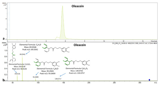 The cardiovascular effects of olive leaves are attributed to oleuropein and oleacein. The EIC chromatogram of oleacein and the spectrum with its explained fragments are presented in Figure 6a,b, respectively.