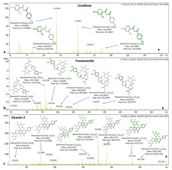 Spectra and MS/MS fragments of (a) licodione, (b) fraxamoside, and (c) vicenin-2.