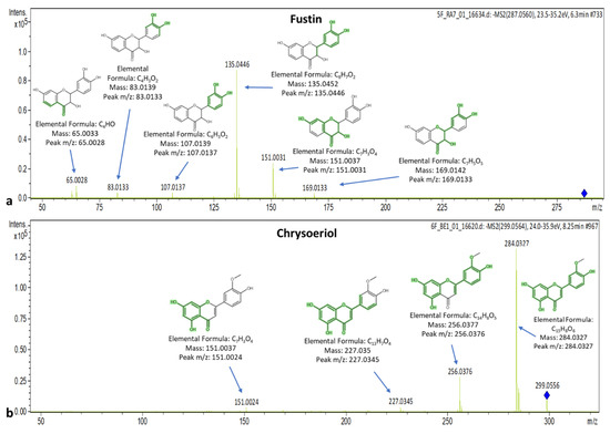 Spectra and MS/MS fragments of (a) fustin and (b) chrysoeriol.
