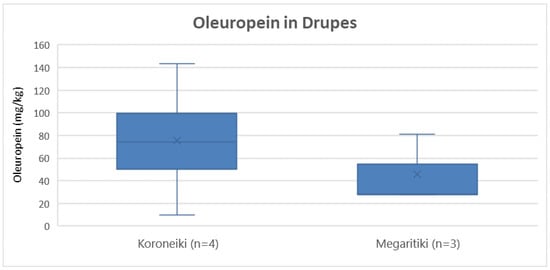 In drupes, descriptive statistics and statistical analysis were performed for the varieties Koroneiki and Megaritiki (n ≥ 3). The quantification results of oleuropein, tyrosol and hydroxytyrosol were examined.