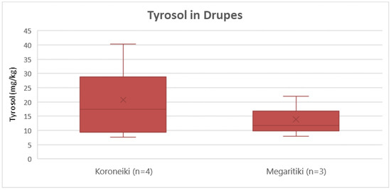 Box and whisker plot for the concentrations of tyrosol between different varieties of drupes.
