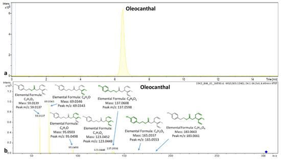 (a) Extracted ion chromatogram of oleacein in a leaf sample; (b) MS/MS spectrum of oleacein with explained fragments.