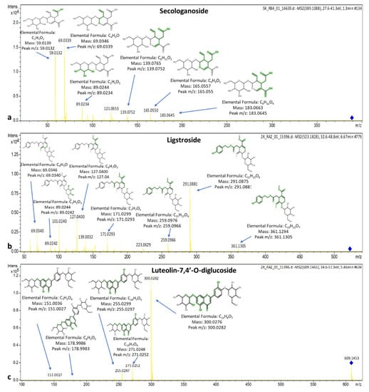 Spectra and MS/MS fragments of (a) secologanoside, (b) ligstroside, and (c) luteolin 7,4′-O-diglucoside.