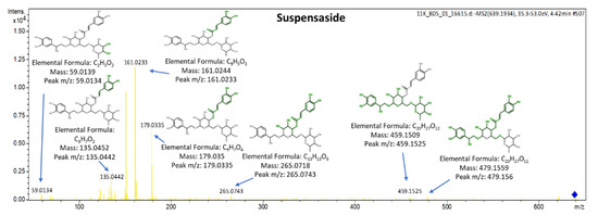 The spectra along with the explained fragments of luteolin-7,4′-O-diglucoside (flavonoid), secologanoside (secoiridoid glucoside), and ligstroside are presented in Figure 14. The spectrum of suspensaside (caffeoyl glucoside) is presented in Figure 15. More information about the identification criteria, the level of the identification and the qualifier ions of the suspects can be found in Table S5.