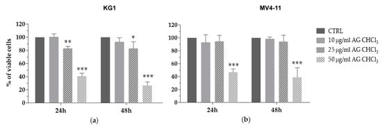 To verify whether AG CHCl3 fraction could alter the viability of AML cells, we treated two AML cell lines, KG1 and MV4-11, with different concentrations (10–25–50 μg/mL) of AG CHCl3 for 24 h and 48 h. AG CHCl3 induced a statistically significant reduction of both AML cell line viability (Figure 1). The reduction of AML cell viability was already evident at 24 h of treatment with 25 μg/mL for KG1 and with 50 μg/mL for MV4-11 cells.