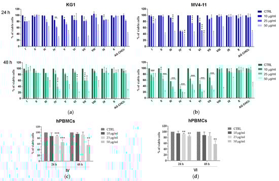 Likewise, to support their specific antitumor effect, we treated healthy peripheral blood mononuclear cells (hPBMCs) with different concentrations (10–25–50 μg/mL) of IV and VI sub-fractions for 24 h and 48 h. Interestingly, their action on hPBMC viability was negligible after treatment with 10 and 25 μg/mL (Figure 3c,d).