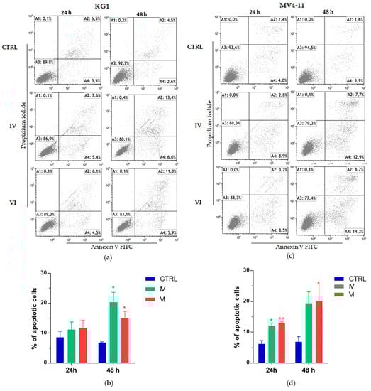 Cytofluorimetric evaluation of apoptosis on AML cell lines after treatment. KG1 and MV4-11 cell lines were treated with 30 μg/mL and 10 μg/mL, respectively, of IV and VI sub-fractions for 24 h and 48 h. Dot plots show a representative experiment on KG1 (a) and MV4-11 (c) cells after 24 h and 48 h of treatment; bar-graphs represent mean ± SD from three independent experiments on KG1 (b) and MV4-11 (d) cells, considering both early and late apoptosis. Statistically significant analyses from unpaired t-test are indicated by asterisks: * p ≤ 0.05, ** p ≤ 0.01.