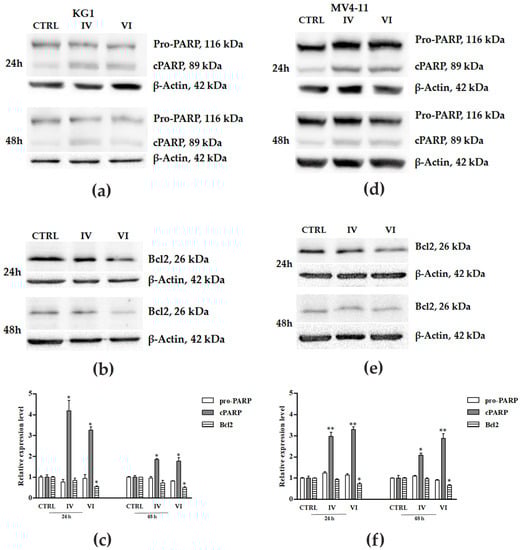 Western blot analysis of apoptosis-related proteins on AML cell lines after treatment. Expression of pro-PARP-1, cleaved PARP (cPARP) and Bcl2 was evaluated in KG1 (a,b) and MV4-11 (d,e) cells treated and not (vehicle-treated cells, CTRL) with 30 μg/mL (for KG1) and 10 μg/mL (for MV4-11) of IV and VI sub-fractions for 24 h and 48 h. β-actin was used as a loading control. Figures and bar-graphs are representative of three independent experiments in KG1 (c) and MV4-11 (f) cells. Data were expressed as means ± SD. Statistically significant analyses from one-way ANOVA followed by Tukey’s Multiple Comparison test are indicated by asterisks: * p ≤ 0.05, ** p ≤ 0.01.