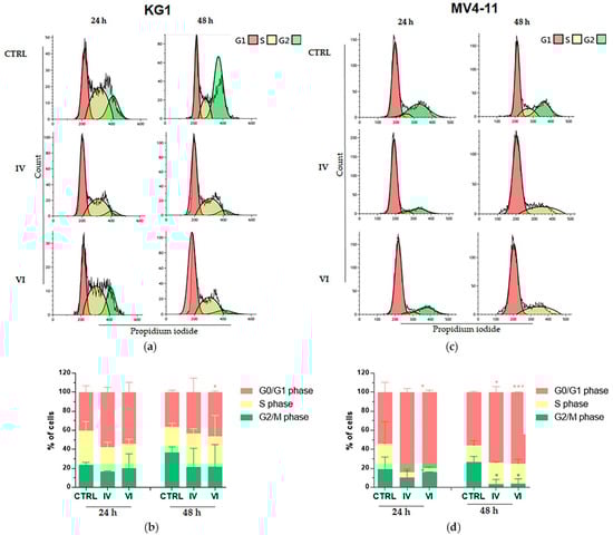 Cytofluorimetric evaluation of AML cells distribution in the cell cycle after treatment. Cell cycle histograms show a representative experiment on KG1 (a) and MV4-11 (c) cells treated with 30 μg/mL (for KG1) and 10 μg/mL (for MV4-11) of IV and VI sub-fractions for 24 h and 48 h compared to untreated control cells (CTRL); the bar-graphs represent mean of three independent experiments on KG1 (b) and MV4-11 (d) cells with SD. Statistically significant analyses from unpaired t-test are indicated by asterisks: * p ≤ 0.05, *** p ≤ 0.001.