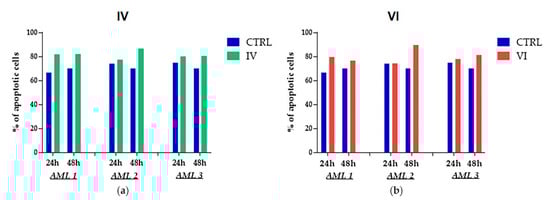 Cytofluorimetric evaluation of apoptosis on primary AML cells after treatment. Bone marrow mononuclear cells (BMMCs) derived from three AML patients were treated with 30 μg/mL of IV (a) and VI (b) sub-fractions for 24 h and 48 h. Percent of apoptotic cells was obtained from the sum of early and late apoptosis of a single experiment.
