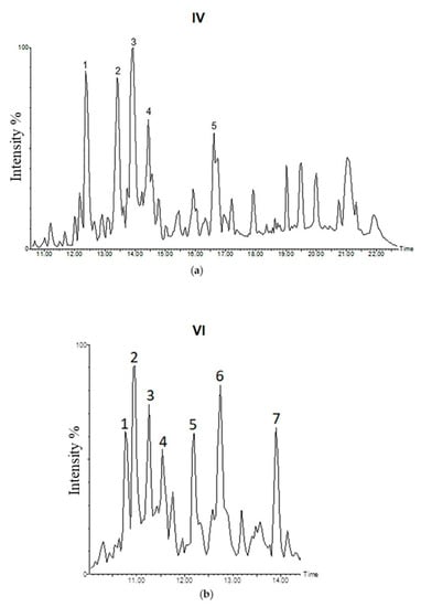 To identify compounds in IV and VI sub-fractions, we performed the LC-MS/MS analysis in negative mode. We identified 5 more abundant picks (1–5) in IV sub-fraction and 7 (1–7) in VI sub-fraction (Figure 8). Due to the absence of literature studies to our knowledge and to the lack of available commercial standards, all compounds were tentatively identified (Table 4 and Table 5) through accurate masses and possible fragmentation patterns.