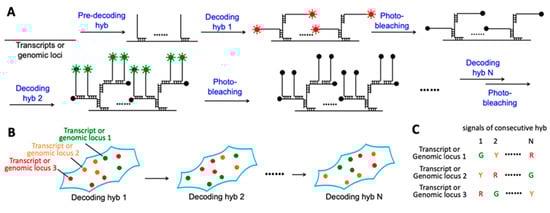 To enable spatial transcriptomics and genomics analysis, a number of methodologies have been investigated, such as combinatorial labeling [11,12,13], reiterative hybridization [14,15,16,17], in situ sequencing [18,19], sequential hybridization [20,21,22], and multiplexed error-robust FISH (MER-FISH) [23,24,25]. Although these methods allow a large number of nucleic acids to be profiled in situ, some nonideal factors still exist. For instance, to permit transcriptome- or genome-wide analysis, the multiplexing capacity of combinatorial labeling and reiterative hybridization needs to be further improved. As a result of its low efficiency of reverse transcription reactions, in situ sequencing can only detect a small fraction of the transcripts. Consequently, RNA species with low copy numbers may not be detectable. In each cycle of SeqFISH and MER-FISH, not all transcripts are stained. As a result, an artificial threshold has to be determined for signal recognition. However, due to the imperfect hybridization efficiency and also the varied number of probe binding sites on transcripts from the same RNA species, any thresholds will lead to some false positive and false negative signals. These errors could be corrected by doing an increased number of hybridization cycles. However, more errors will be generated in these additional cycles, leading to the more complicated data analysis and correction process.