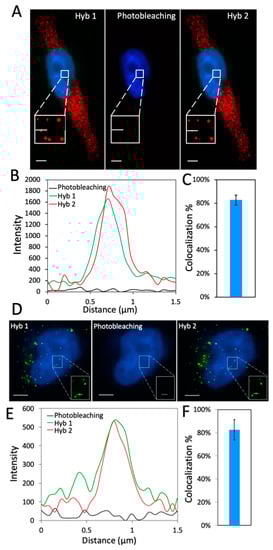 For the success of this C-FISH approach, two critical requirements exist. First, the target staining signals generated in each analysis cycle must be removed with high efficiency. As a result, the leftover signals from the previous cycles will not lead to false positive results in the following cycles. In addition, the nucleic acids integrity should not be damaged during this signal removal process, and all the pre-decoding and decoding probes should remain hybridized to their specific targets. In this way, the RNA or DNA molecular targets can be restained and visualized in the same location in the subsequent cycles. Our group has demonstrated that photobleaching can effectively remove the fluorescence signals while maintaining the integrity of nucleic acids [14]. For these reasons, here we apply photobleaching to erase the fluorescence signals. To evaluate whether the probes remain hybridized to their targets after photobleaching, we stained mRNA GAPDH and Ki67 (Figure 2) with two cycles of C-FISH. After photobleaching, almost all the fluorescence signals are removed. Upon the hybridization of the second cycle decoding probes, the GAPDH and Ki67 transcripts are successfully restained (Figure 2A,B,D,E). We counted the stained transcripts in 30 cells and observed that over 80% of fluorescent spots identified in the first cycle reappear in the second cycle (Figure 2C,F). These results are consistent with the ones generated by staining the same transcript with 2 color FISH probes [5]. The small fraction of spots that do not reappear in the second cycle may be attributed to the non-specifically bound probes. To exclude these false positive signals, we consider only the spots colocalized in the first two hybridization cycles as real signals, which correspond to the target staining. This choice of real signals is also justified by the results in Section 2.3. The results here confirm that photobleaching can efficiently remove the fluorescence signals without damaging the nucleic acids integrity, and also indicate that all of the applied probes remain hybridized to their targets throughout the analysis cycles.