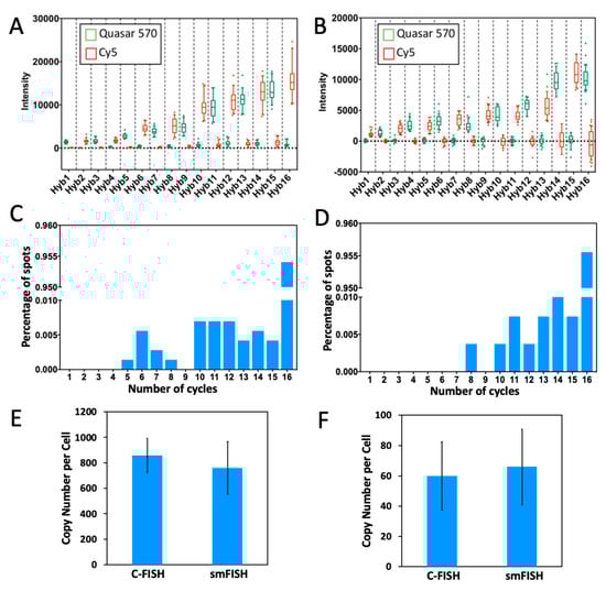 To demonstrate the feasibility of applying C-FISH for multiplexed RNA analysis, we stained mRNA GAPDH and Ki67 (Figure 6) simultaneously in 16 consecutive hybridization cycles. In the odd cycles, GAPDH and Ki67 transcripts were detected with Quasar 570 and Cy5 labeled probes, respectively. And in the even cycles, mRNA GAPDH and Ki67 were stained with Cy5 and Quasar 570, respectively. Throughout the 16 cycles, all the analyzed FISH spots were only observed in the correct fluorescence channel as designed, suggesting the high-specificity and minimum cross-hybridization of the decoding probes for different targets. We also quantified the signal intensities of the mRNA spots in both fluorescence channels in each cycle (Figure 7A,B). The signal from the correct fluorescence channel is increased with the cycle number, while the signal intensities from the other channel remains at the background level. This enhanced signal to background ratio facilitates the spot identification in the latter cycles. As a result, almost all of spots colocalized in the first two cycles reoccur in the third cycle, and more than 95% of these spots are successfully detected in all the following cycles (Figure 7C,D). We use the number of spots appearing in all the 16 cycles to calculate the transcript copy number per cell. The generated results are consistent with the ones produced by conventional smFISH (Figure 7E,F) and the ones reported using RNA-Seq [27]. These data suggest that C-FISH enables multiplexed RNA analysis in single cells in situ, with over 95% detection sensitivity and close to “0” raw data error rate.
