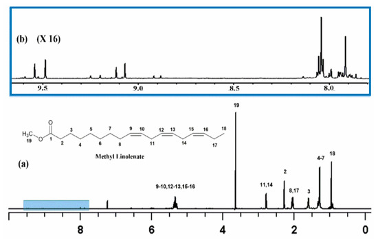 (a) 800 MHz 1H-NMR spectrum of 20 mg methyl linolenate in CDCl3 subjected to heating at 40 °C for 48 h, number of scans = 64, acquisition time = 1.02 s, experimental time = 6.5 min, relaxation delay = 5 s, T = 298 K; (b) selected region of the C–O–O–H resonances of its primary oxidation products.
