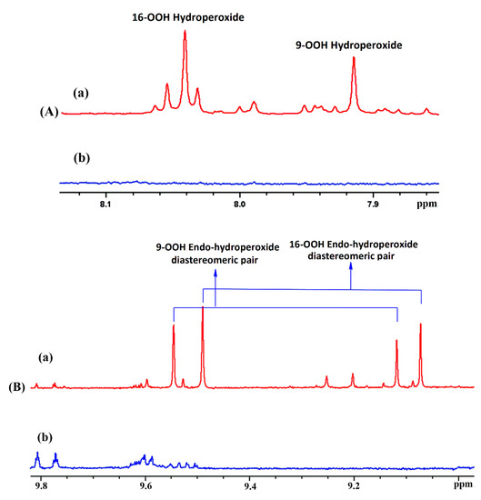 The excellent resolution achievable in the region of hydroperoxide C–O–O–H protons (δ 7.70 to 9.6, Figure 1 and Figure 2) allowed an accurate integration and, thus, quantification of primary oxidation products. Table 3 shows quantification of the hydroperoxide 1H-NMR resonances based on their integration, with respect to the total integral of the CH3- group at 0.86 ppm. A comparison with literature integration data [36] shows very good agreement, despite differences in experimental conditions. As pointed out [10,12,35,36,37,38], the peroxyl radicals derived from 12- and 13- hydroperoxides undergo rapid 1,5-cyclization to form two five-membered isomeric internal 9- and 16-hydroperoxy cyclo endo-peroxides. This rapid cyclization results in lower concentrations of the internal 12- and 13-hydroperoxides (14% and 15%, respectively) relative to the external 9- and 16- hydroperoxides (29% and 41%, respectively) (Table 3). Similar relative concentrations of hydroperoxides have been found in the literature under a wide range of oxidation conditions [10,12,35,36,37,38].