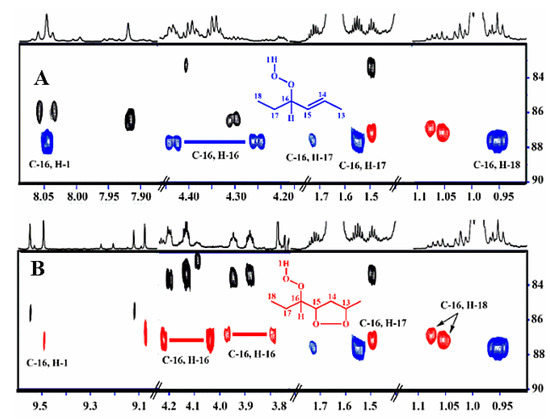 Selected regions of 800 MHz 1H-13C HMBC NMR spectrum of 20 mg methyl linolenate in CDCl3, subjected to heating at 40 °C for 48 h, number of scans = 32, number of increments 256, total experimental time = 12 h, T = 298 K. The critical cross-peak connectivities of C-16 with H-1(OOH), H-16 (1J(13C, 1H)), H-17, and H-18 of the 9-cis, 12-cis, 14-trans-16-OOH hydroperoxide (A), and two diastereomeric 9-cis, 11-trans-16-OOH endo-hydroperoxides (in red) (B), are illustrated.