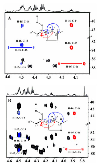 Figure 3 illustrates a selected region of the 1H-13C HMBC spectrum. Despite the low concentration of the hydroperoxides and endo-hydroperoxides (≈1.36–8.23%), the 1H-13C HMBC experiment revealed several 13C connectivities between δ 82 and 88 for the C–O–O–H carbons. Furthermore, the 1H-13C HMBC spectrum demonstrates very informative connectivities of the C–O–O–H carbon at δ of 87.5, with the terminal –CH3 (δ 0.9) and CH3–CH2 (δ 1.72, 1.55) protons, thus confirming the presence of the 16–OOH hydroperoxide. Of diagnostic importance are also the 1H-13C HMBC connectivities of the two deshielded terminal CH3 groups at δ 1.05 and 1.07 with the respective hydroperoxide carbons (δ 87.2, and 87.0) and C–O–O–H protons in the strongly deshielded region at δ 9.50 and 9.08, respectively (Figure 3). Furthermore, their CH–O–O–H protons at δ 4.13 and 3.87 demonstrate very informative additional connectivities in the region of the hydroperoxide carbons (Figure 4). This supported an unequivocal presence of two 16–OOH endo-hydroperoxide isomers of the oxidized fatty acid sample. Thus, the H-16 multiplet at δ 4.13 demonstrates connectivities with C-16 (δ 87.2), C-15 (δ 83.35), and C-14 (δ 40.7) (Figure 4A). The C-16 also shows connectivities with the H-15 multiplet (δ 4.49), which shows a characteristic doublet with C-15, due to 1J(13C,1H) of 146 Hz, and connectivities with C-13 (δ 82.8) and C-14. Similar connectivities were observed for the H-16 multiplet (δ 3.87) of the second diastereoisomer (Figure 4B).