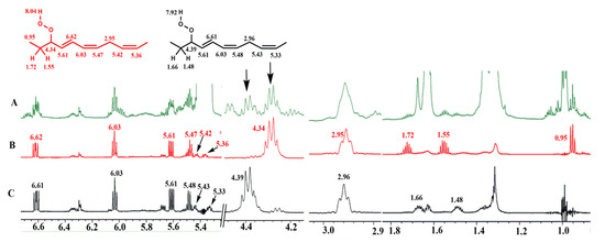 Furthermore, the identification of the above hydroperoxides was confirmed with the use of selective 1D TOCSY experiments [29]. An important application of the 1D experiment is the selective excitation of a suitable target resonance of the compound of interest, which reveals an extensive spin system belonging to a single chemical analyte, even in heavily overlapped resonances [30,31,32,33,34]. Selective excitation of the allylic CH–O–O–H proton of the 9-cis, 12-cis, 14-trans-16-OOH geometric hydroperoxide isomer at δ 4.34 (Figure 5B) shows connectivities with the terminal C-18 methyl group at δ 0.95, the H-17 (δ 1.72 and 1.55), the conjugated olefinic protons H-15 (δ 5.61), H-14 (δ 6.62), H-13 (δ 6.03), H-12 (δ 5.47), the H-11 bis allylic protons (δ 2.95), the olefinic protons H-10 (δ 5.42), and H-9 (δ 5.36). The selective excitation of the 10-trans, 12-cis, 15-cis-9-OOH isomer at δ 4.39 shows connectivities with H-8 (δ 1.66 and 1.48), the conjugated olefinic protons H-10 (δ 5.61), H-11 (δ 6.61), H-12 (δ 6.03), H-13 (δ 5.47), the H-14 bis allylic protons (δ 2.96), the olefinic H-15 (δ 5.43), and H-16 (δ 5.33) (Figure 5C).