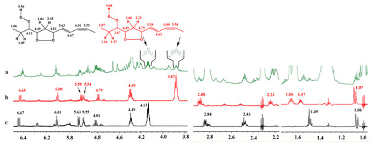 Table 2 presents a comparison of the 1H- and 13C-NMR experimental chemical shifts of endo-hydroperoxides of methyl linolenate of the present work with those reported in the literature for HPLC-isolated endo-hydroperoxides. The deviation of δ (1H) was found to be ≤0.02 ppm with the exception of the chemical shift of the hydroperoxide proton, which is expected to be very sensitive to inter- and intramolecular hydrogen bonds, temperature, and solution conditions. The deviation of δ(13C) was found to be ≤0.6 ppm. Therefore, it can be concluded that the agreement of the present NMR data with those of isolated analytes is excellent.