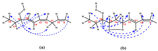 Schematic presentation of the selective 1D TOCSY correlations which were observed in the case of the 9-cis, 12-cis, 14-trans-16-OOH hydroperoxide (a), and the 9-cis, 11-trans-16-OOH endo-hydroperoxide (b) of the methyl linolenate primary oxidation products.