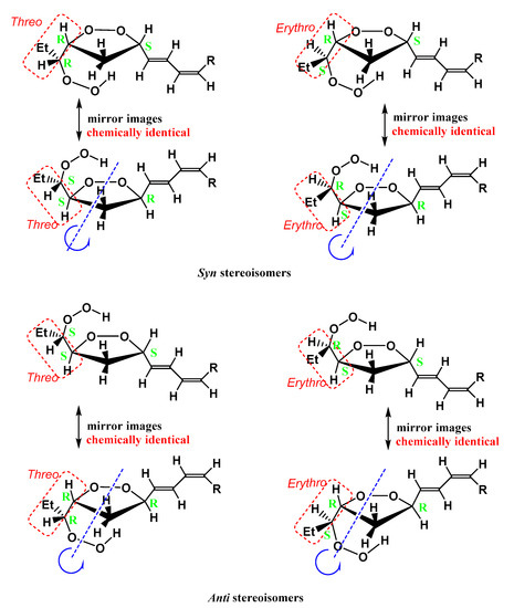 The 23 = 8 stereoisomers (23–1 = 4 pairs of enantiomers) of 9-cis, 11-trans, 16-OOH linolenate endo-hydroperoxides investigated in the present work.