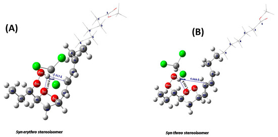 Table S2 shows a comparison of computational 1H-NMR chemical shifts of the four model diastereomeric endo-hydroperoxides with the experimental chemical shifts of the full-length molecules. The syn threo stereoisomer, both in PCM and with the inclusion of a discrete solvation molecule of CHCl3 in PCM, shows a strong magnetic non-equivalence of the C(14)Ha,b protons, which is in excellent agreement with the experimental data. On the contrary, the calculated C(14)Ha,b chemical shifts are very similar in the syn threo stereoisomer. This supports the conclusion that the stereoisomer with δ(OOH) = 9.50 ppm can be assigned to 9-cis, 11-trans, syn threo, 16-OOH endo-hydroperoxide. The syn erythro and anti erythro stereoisomers show strong magnetic non-equivalence of the C(14)Ha,b protons in both PCM and with the inclusion of a discrete solvation molecule of CHCl3 (Table S2); thus, they cannot be distinguished on the basis of this criterion. However, the syn erythro stereoisomer shows very weak interaction of the hydroperoxide proton with the O15 of the five-member endo-peroxide ring, contrary to the medium hydrogen bond interaction of the anti erythro stereoisomer (Figure 9 and Figure S2). Therefore, the resonance at 9.08 ppm, which is shielded relative to that at 9.50 ppm, may be assigned to 9-cis, 11-trans, syn erythro, 16-OOH endo-hydroperoxide.