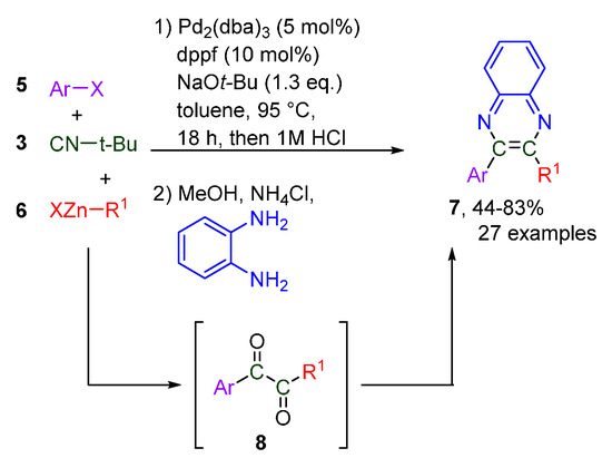 When the ‘classical’ palladium-catalyzed Negishi conditions are adapted by the addition of an isocyanide, a one-pot selective double isocyanide insertion was observed (Scheme 3) [22]. The choice of ligand is instrumental in the double insertion, as ligands other than dppf give mixtures of mono- and diketone products 8. Although the catalytic system tolerates many different types of alkyl zinc reagents 6, the use of isocyanides other than tert-butyl isocyanide resulted in poor to no conversion. This methodology was used to efficiently generate quinoxalines 7 via double condensation with o-phenylenediamine, in a three-step sequence, without intermediate purification (Scheme 3).
