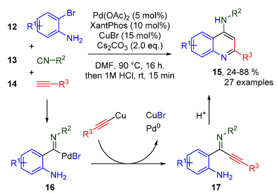 While an imidoylative Sonogashira reaction was already reported in 2013 [24], the initial publication only used t-BuNC as an isocyanide input, and hydrolyzed the formed ynimine in situ. In 2017, our group extended this methodology to include a nucleophile on the o-position of the aryl bromide substrate 12, yielding 4-aminoquinolines (Scheme 5). Formation of the imidoylative Sonogashira intermediate 17 proceeds through transmetalation of an in situ formed copper acetylide to imidoyl palladium 16. The afforded ynimine 17 readily undergoes acid-mediated intramolecular conjugate addition to directly afford medicinally valuable 4-aminoquinolines 15 [25]. The methodology is compatible with a range of different isocyanides, with secondary and primary isocyanides being well tolerated. Even secondary isocyanides, bearing an additional amine or carbamate moiety, were smoothly incorporated in this Sonogashira-type cross-coupling. The yields are inversely correlated to the electron density of the arenes, as decoration of either the 2-bromoaniline 12 or phenylacetylene 14 with electron-withdrawing groups resulted in lower yields, and more side reactions, most likely due to less facile, and more promiscuous cyclizations. A similar catalytic synthesis of thiochromen-4-ones was reported in 2018. [26]