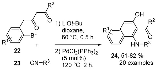 This methodology was extended in the same year, introducing an additional methylene functionality to the substrate 22. In this case, medicinally relevant amino-hydroxynaphthyl ketones 23 were obtained in moderate to good yields [29]. The use of tertiary isocyanides typically affords the 4-tert-butylaminonaphth-2-ols in good yields under the optimized conditions (Scheme 7). The authors did not fully investigate the scope regarding the isocyanide input, although a single cyclohexyl isocyanide entry afforded the corresponding naphthol 23 in a yield of 51%.