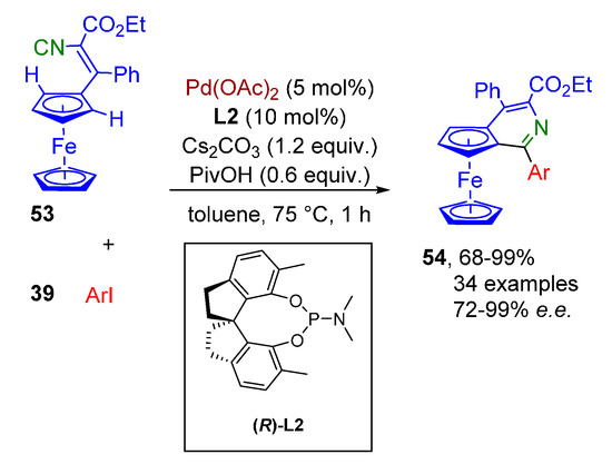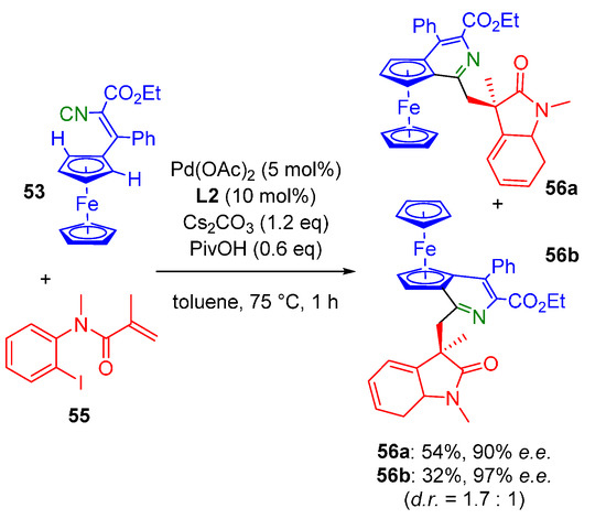 The same group later reported an asymmetric variation of this transformation (Scheme 16). By using (ferrocenyl)vinyl isocyanides 53 and aryl iodides 39 in combination with chiral ligand L2, pyrido-fused ferrocenes 54 could be isolated in good to near-quantitative yields, with high ee [39] Similarly, with N-(2-iodophenyl)-N-methylmethacrylamide 55 additional alkene insertion occurs prior to isocyanide insertion. This cascade affords the highly complex structures 56 with high ee However, the chiral induction of the indolinone is moderate, leading to a d.r. of only 1.7:1 of 56a:56b (Scheme 17).