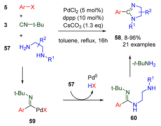 In 2014, Schipman et al. extended the imidoylative Buchwald-Hartwig type cross-coupling to include the use of diamines 57 as coupling partners [43]. This reaction is indicative for imidoylative Buchwald-Hartwig couplings, and proceeds via the oxidative addition of an aryl halide 5 to in situ generated Pd0, after which a well-documented 1,1-migratory insertion of the isocyanide can take place. The transient imidoyl palladium intermediate 58 is readily attacked by ambient diamine 57, which affords the amidine 60 after reductive elimination. This amidine smoothly undergoes an intramolecular transimination to afford 2-arylated imidazolines 58 (Scheme 18), releasing t-butylamine. The products are typically formed in good yields, although somewhat lower yields are reported for sterically hindered aryl halides, or less nucleophilic variations of diamine 57, such as o-phenylenediamine. The authors also utilized this methodology to facilitate a direct synthesis of a complex chiral Pybim ligand 63 (Scheme 19).