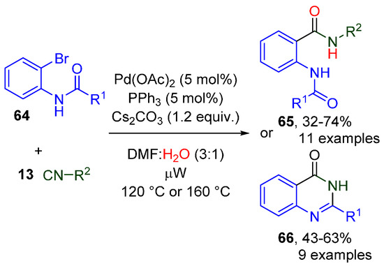 A related method affords 2-substituted (3H)quinazolin-4-ones from N-acyl 2-bromoanilines 64. [44] This method relies on the direct hydroxyimidoylation of the aryl halides with water as the nucleophile, affording bisamides 65 at 120 °C from either tert-butyl isocyanide or cyclohexyl isocyanide (Scheme 20). If the temperature is raised to 160 °C, the generated bisamide undergoes a cyclocondensation to quinolinones 66, which is accompanied by spontaneous de-tert-butylation. It should be noted that similar one-pot hydroxyimidoylation/cyclization cascades are also reported in the syntheses of indolin-1-ones [45] and fused dihydropyrrolimines [46].