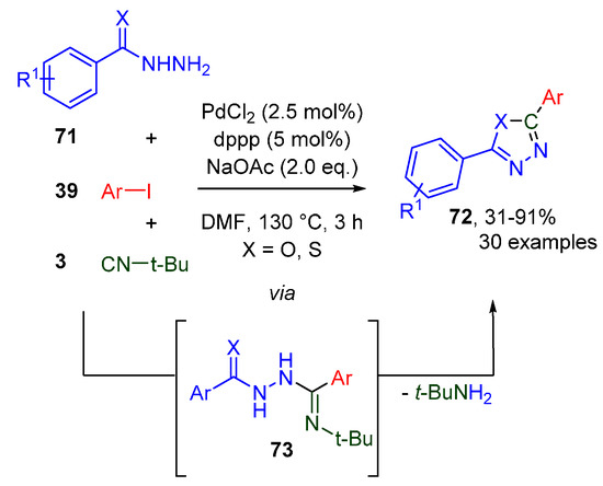 The imidoylative Buchwald-Hartwig cross-coupling can also be employed in combination with (thio)hydrazides 71 in a redox-neutral synthesis of 1,3,4-oxadiazoles and thiadiazoles 72 [52]. As the isocyanide is only used as a C1 building block, the scope was left uninvestigated, and only t-BuNC was employed in this coupling (Scheme 23). The cross-coupling is also successful with aliphatic hydrazides, but results in a significantly reduced yield. The proposed intermediate (thio)acylamidrazone 73 undergoes a smooth cyclocondensation under the basic reaction conditions.