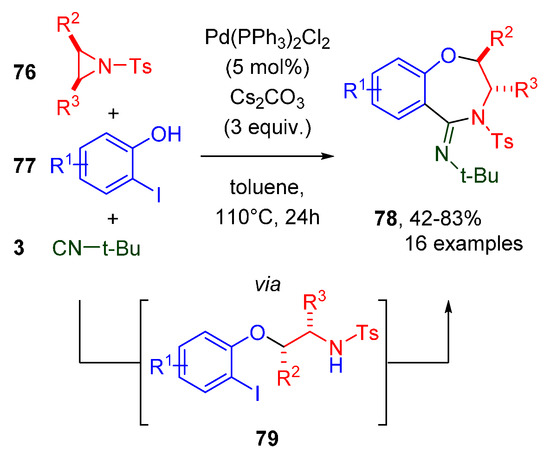 An interesting multicomponent cascade reaction with N-tosylaziridines 76 and o-iodophenols 77 affords access to benzoxazepines 78 [56]. The cascade is initiated by the base-promoted ring-opening of the aziridine by iodophenol 77 (Scheme 25). A subsequent intramolecular aminoimidoylation directly affords the polysubstituted benzoxazepines 78 in good yields, and in full trans-selectivity. The regioselectivity is controlled by sterics, opening the aziridine on the least hindered carbon. Again, reactions with tertiary isocyanides afford the corresponding benzoxazepines in good yields. The only secondary isocyanide (cyclohexyl isocyanide) that was tested afforded the product in a moderate 42%.