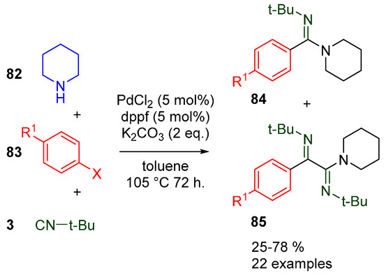 In an intermolecular variant of this double insertion, the group of Kègl investigated the substituent effects of aryl halides 83 on the imidoylative cross-coupling with tert-butyl isocyanide 3 and secondary amines 82 [58]. Typically, this imidoylative Buchwald-Hartwig type multicomponent reaction affords the ketimine-amidine 85 in good yields, although in most cases a mixture of 85 and the amidine 84 is formed (Scheme 27). No linear Hammett correlation between the electron-donating or -withdrawing substituents and the yield or selectivity of this transformation was found. Interestingly, the authors note that the use of various bromoarene analogues of 83 (X = Br) typically favor a single isocyanide insertion towards benzamidines 84, implying the halide plays a role in the mechanism. The broad substrate scope investigation was only performed with tert-butyl isocyanide and piperidine; other isocyanides showed no conversion under the reaction conditions.