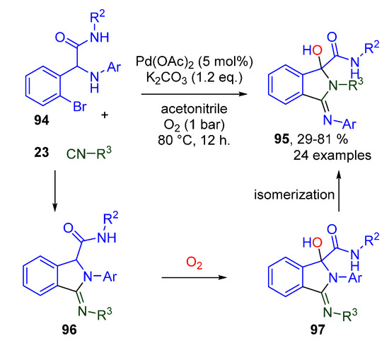 An intramolecular Buchwald-Hartwig coupling with aryl iodides 80 bearing an internal nucleophile on the ortho position affords 2-amino-3-iminoindolenines 81 via double isocyanide insertion (Scheme 26) [57]. This reaction is fully compatible with tertiary, secondary, and aromatic isocyanides, but fails to afford any product 81 when primary aliphatic or α-acidic isocyanides are employed.