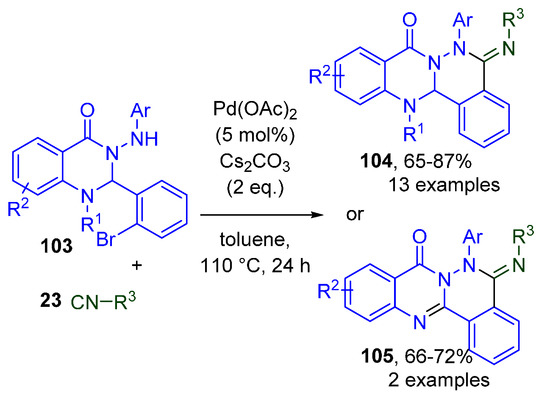 - Senadi, G.C.; Guo, B.-C.; Chang, Y.-C.; Hu, W.-P.; Wang, J.-J. Synthesis of Fused-Pyrazines via Palladium-Catalyzed Double Benzyl Isocyanide Insertion and Cross-Dehydrogenative Coupling. Adv. Synth. Catal. 2018, 360, 491–501. [Google Scholar] [CrossRef]
