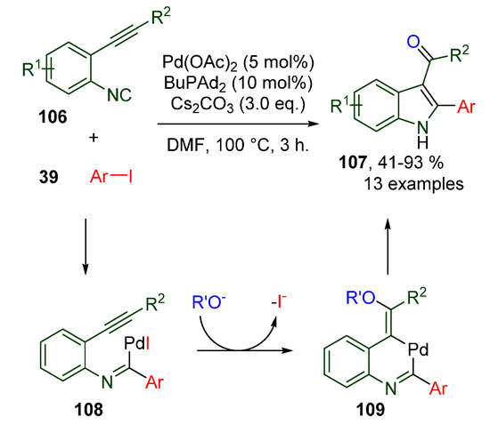 - Qiu, G.; Qiu, X.; Liu, J.; Wu, J. Switchable Synthesis of 3-Cyanoindoles and 3-Amidylindoles via a Palladium-Catalyzed Reaction of N,N-Dimethyl-2-alkynylaniline with Isocyanide. Adv. Synth. Catal. 2013, 355, 2441–2446. [Google Scholar] [CrossRef]