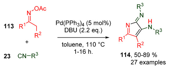- Senadi, G.C.; Lu, T.-Y.; Dhandabani, G.K.; Wang, J.-J. Palladium-Catalyzed Double-Isocyanide Insertion via Oxidative N-O Cleavage of Acetyl Oximes: Syntheses of 2H-Pyrrol-2-imines. Org. Lett. 2017, 19, 1172–1175. [Google Scholar] [CrossRef] [PubMed]