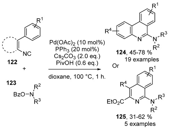 The radical cyclization of o-isocyano biphenyls and related structures towards substituted phenanthridines was extensively reviewed by Studer in 2015 [37]. However, several palladium-catalyzed ionic syntheses of phenanthridines were also reported recently. In most of these cases, the mechanistic implications of the cycloaromatization step are not fully elucidated. These formal C-H functionalizations can either rely on a classic two step SEAr, as several examples above, or have a more concerted character, bordering on electrocyclizations.