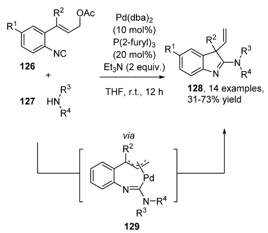 - Nanjo, T.; Tsukano, C.; Takemoto, Y. Synthesis of 3,3-Disubstituted 2-Aminoindolenines by Palladium-Catalyzed Allylic Amidination with Isocyanide. Synlett 2014, 25, 1473–1477. [Google Scholar] [CrossRef]