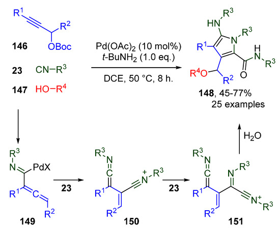 - Qiu, G.; Wang, Q.; Zhu, J. Palladium-Catalyzed Three-Component Reaction of Propargyl Carbonates, Isocyanides, and Alcohols or Water: Switchable Synthesis of Pyrroles and Its Bicyclic Analogues. Org. Lett. 2017, 19, 270–273. [Google Scholar] [CrossRef]