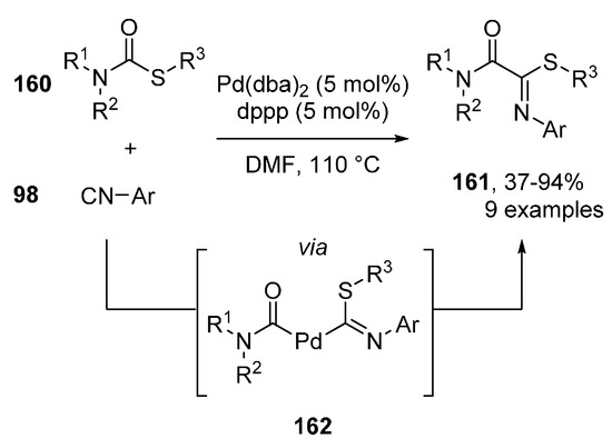 - Shiro, D.; Fujiwara, S.-i.; Tsuda, S.; Iwasaki, T.; Kuniyasu, H.; Kambe, N. Palladium-catalyzed Insertion Reactions of Isocyanides into Thiocarbamates and Selenocarbamates. Chem. Lett. 2015, 44, 465–467. [Google Scholar] [CrossRef]