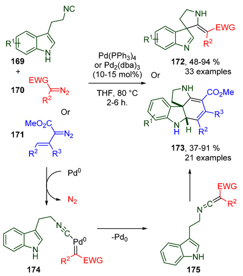 - Chen, G.-S.; Chen, S.-J.; Luo, J.; Mao, X.-Y.; Chan, A.S.-C.; Sun, R.W.-Y.; Liu, Y.-L. Tandem Cross-Coupling/Spirocyclization/Mannich-Type Reactions of 3-(2-Isocyanoethyl)indoles with Diazo Compounds toward Polycyclic Spiroindolines. Angew. Chem. Int. Ed. 2020, 59, 614–621. [Google Scholar] [CrossRef]