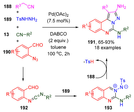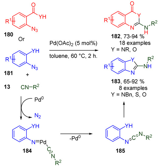 - Ansari, A.J.; Pathare, R.S.; Maurya, A.K.; Agnihotri, V.K.; Khan, S.; Roy, T.K.; Sawant, D.M.; Pardasani, R.T. Synthesis of Diverse Nitrogen Heterocycles via Palladium-Catalyzed Tandem Azide-Isocyanide Cross-Coupling/Cyclization: Mechanistic Insight using Experimental and Theoretical Studies. Adv. Synth. Catal. 2018, 360, 290–297. [Google Scholar] [CrossRef]