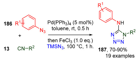 - Pathare, R.S.; Ansari, A.J.; Verma, S.; Maurya, A.; Maurya, A.K.; Agnihotri, V.K.; Sharon, A.; Pardasani, R.T.; Sawant, D.M. Sequential Pd(0)/Fe(III) Catalyzed Azide-Isocyanide Coupling/Cyclization Reaction: One-Pot Synthesis of Aminotetrazoles. J. Org. Chem. 2018, 83, 9530–9537. [Google Scholar] [CrossRef] [PubMed]