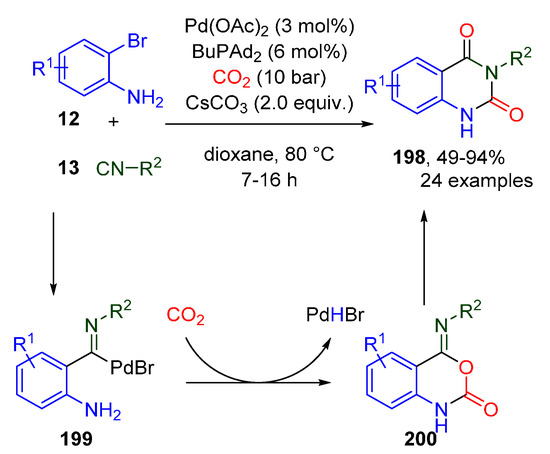 - Xu, P.; Wang, F.; Wei, T.-Q.; Yin, L.; Wang, S.-Y.; Ji, S.-J. Palladium-Catalyzed Incorporation of Two C1 Building Blocks: The Reaction of Atmospheric CO2 and Isocyanides with 2-Iodoanilines Leading to the Synthesis of Quinazoline-2,4(1H,3H)-diones. Org. Lett. 2017, 19, 4484–4487. [Google Scholar] [CrossRef] [PubMed]